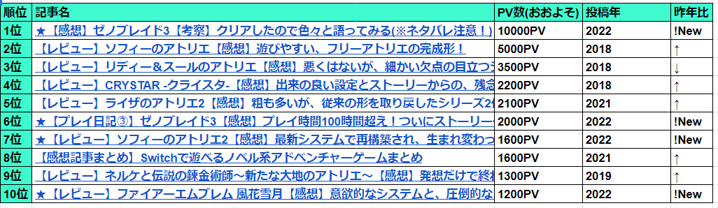2022年にアップした記事は4記事ランクインしましたね。既に上で挙げたゼノブレとアトリエを除くと、意外や意外、「ファイアーエムブレム風花雪月」の記事がまあまあ伸びました。