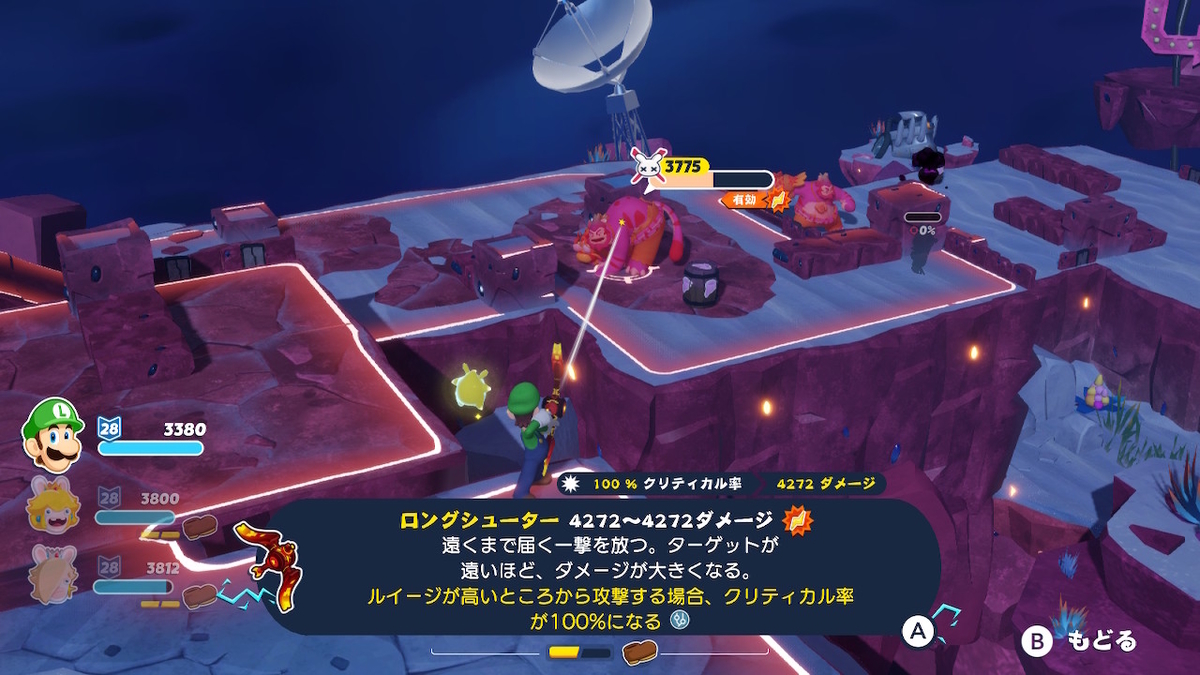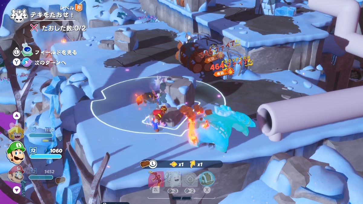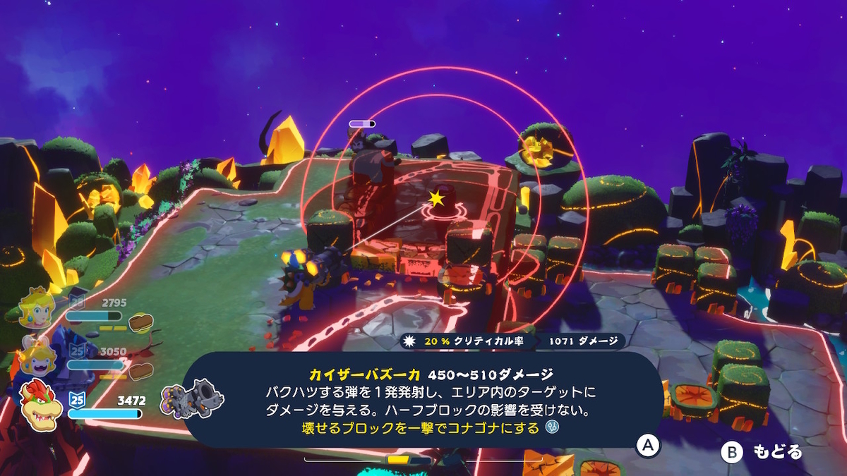 例えば、敵を単に殲滅するだけであれば、攻撃特化能力であるラビッツマリオや試行回数を稼ぎやすいマリオが有効ですが、オブジェクトを破壊するのであれば、ピーチやクッパのような、通常攻撃が範囲型のユニットが有効です。