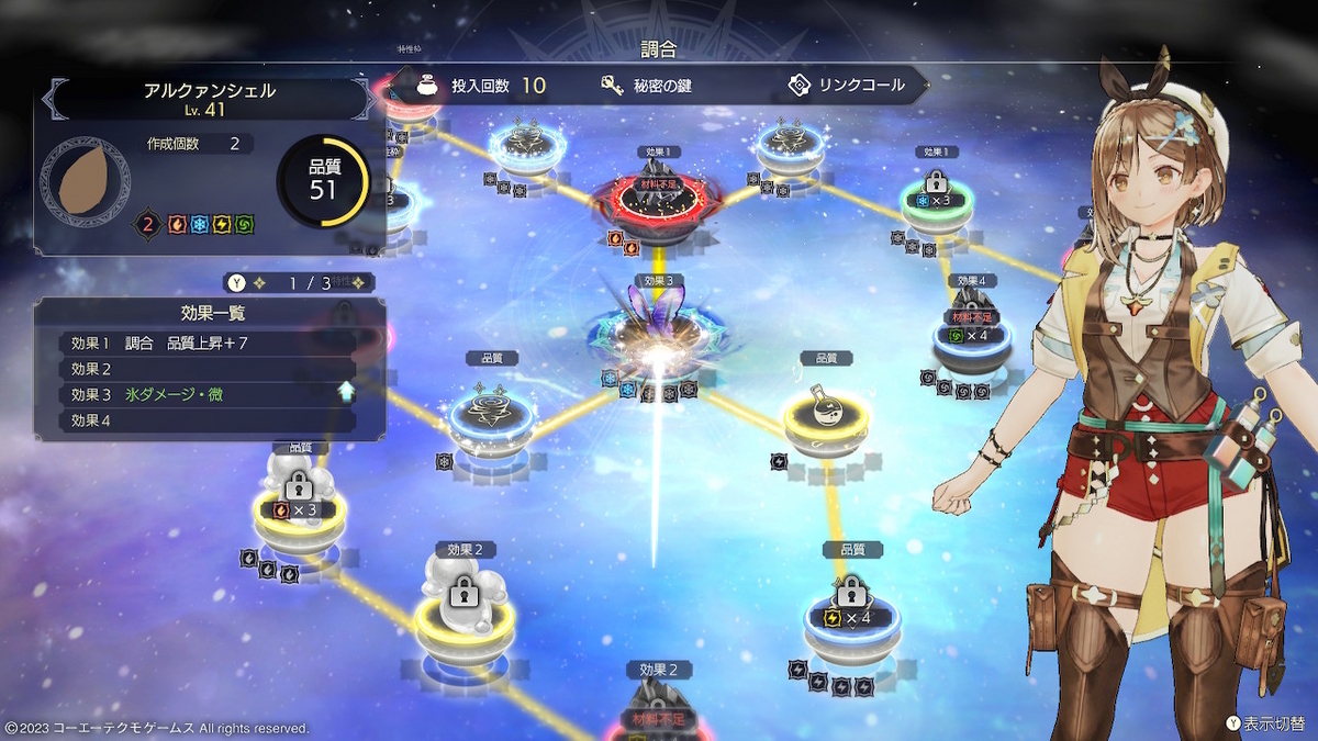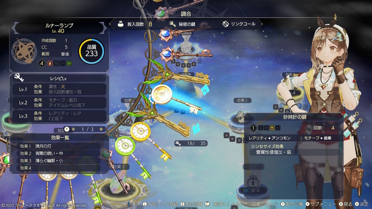 例えば、調合時の属性値をアップさせたり、調合投入アイテムを増加させたりと、カギによって別のアクションを追加させることが出来るため、かゆい所に手が届くような仕様になっていました。