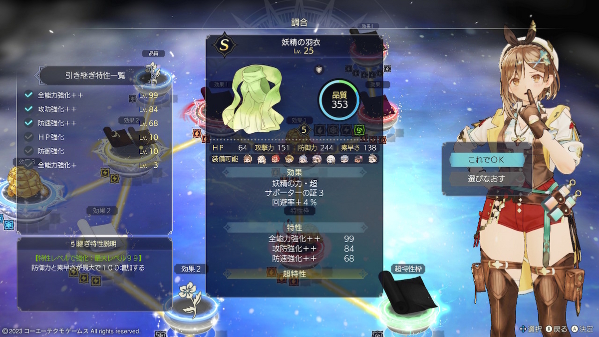 調合面の良さはですね、調合時にワンアクション追加できるので、調合の選択肢が増えているのが良いです。